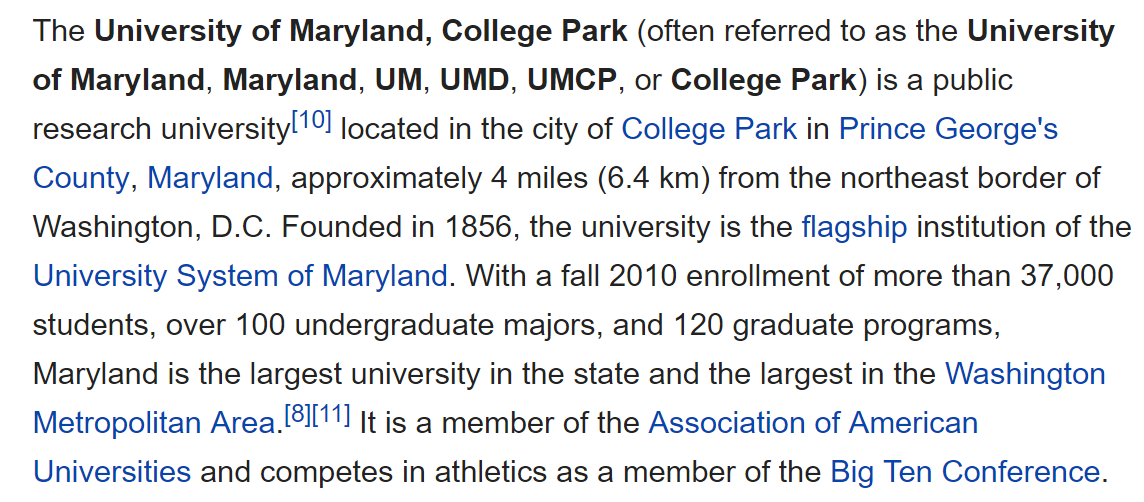 Wikipedia entry for the University of Maryland showing light blue highlighted links