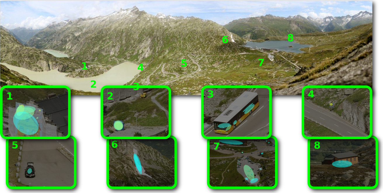 We show a sample of the detected regions using ellipses. We tag the locations with numbers and show the detected region in the corresponding thumbnails. Our system identifies a variety of regions at multiple scales. It locates humans, vehicles, buildings and even features of the landscape such as a glacier. This shows the generality of our approach.