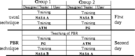 We blocked the design on technique, perspective, document, and reviewer group. Since we could not ask participants to apply their usual technique after they had learned PBR (we assume that the learning of a systematic technique may bias future application of a non-systematic one) we chose to do all usual technique tests on the first day, and have the training in and application of PBR take place on the second day. Additionally, in order to minimize any learning effects (we assume that participants may not only need some practice to get used to applying PBR, but may also need practice in recording defects on our forms) we placed a small training session before each test. The whole experimental design is illustrated below, and shows the sequence of events for both of the groups of participants (each composed in turn of subjects applying each of the PBR perspectives):
