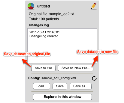 After you have finished exploring the dataset in LifeFlow, you may want to save your work. LifeFlow supports saving the dataset after it has been modified (e.g. selection of a subset of the original dataset), so the users can load the modified dataset and continue the analysis later. LifeFlow provides two ways to save the dataset: save to the original file, or save to a new file.