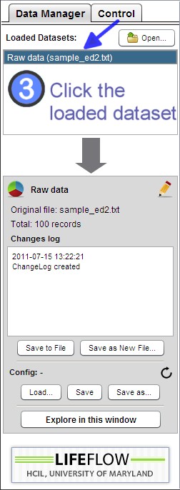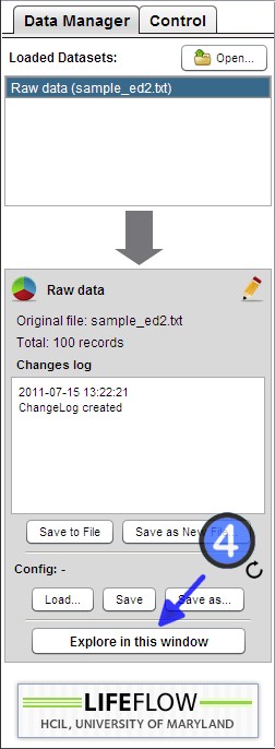 LifeFlow allows the users to load multiple data files into the system at the same time. Each loaded data file is called dataset. Having multiple datasets loaded, the users can switch between datasets easily. Users can also create a new dataset from a subset of the loaded dataset (Section 3.3). For example, users loaded the dataset and remove patients who survived from the dataset then save it as new dataset called "dead patients". All datasets are listed in the Data Manager Tab.