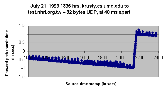 This example is from an experiment in which UDP packets, each containing 32 bytes of data, were sent from krusty.cs.umd.edu to test.nhri.org.tw (Taiwan), with the inter-packet gap being 40 ms. This experiment was conducted on July 23, 1998 at 1335 hrs EST.