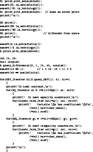 A basic function of the library is checking whether a relation is empty (its Presburger formula is unsatisfiable), or whether a relation contains all possible tuples (its Presburger formula is a tautology). Use following member functions to check these conditions.