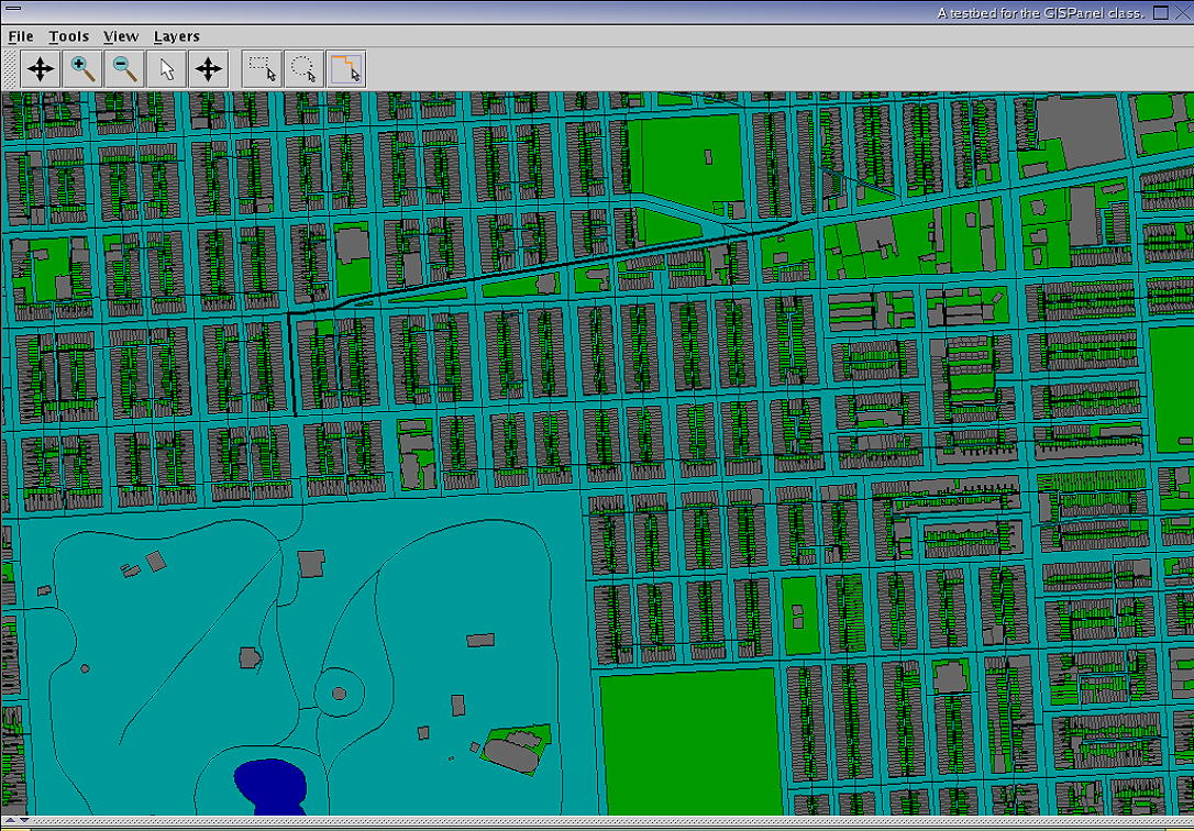 Certain layers have more specific spatial properties, such as the street grid. Curved streets are captured by a geometric construct called a polyline. This is essentially a collection of line segments connected end to end, which can then be interpreted as a linear interpolation of the actual shape of the street. The street grid is actually stored as a collection of street centerlines, with intersections thus being represented geometrically as points. We can view the street grid as a network of vertices and edges, where the vertices are intersections and the edges are streets. In the street grid layer, we might want to store just the intersections. This is done using a PR, or Point Region Quadtree [Shaffer2001, 441]. The PR Quadtree implementation utilized here contains only one copy of each point, as we are making the assumption that there can be only one intersection at a given point. However, it is also important to store the actual street centerlines spatially. Suppose we want to locate the street closest to a given location. In order to accomplish this sort of analysis, we utilize a structure referred to as a first degree Polygonal Map (PM1) Quadtree [Samet1990]. This structure allows GURTIE to capture the spatial location of the streets and their endpoints within the same spatial construct.