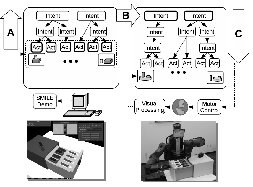 During learning, a robot infers a hierarchical representation of a demonstrator’s intentions that explains why the demonstrator performed the observed actions.
