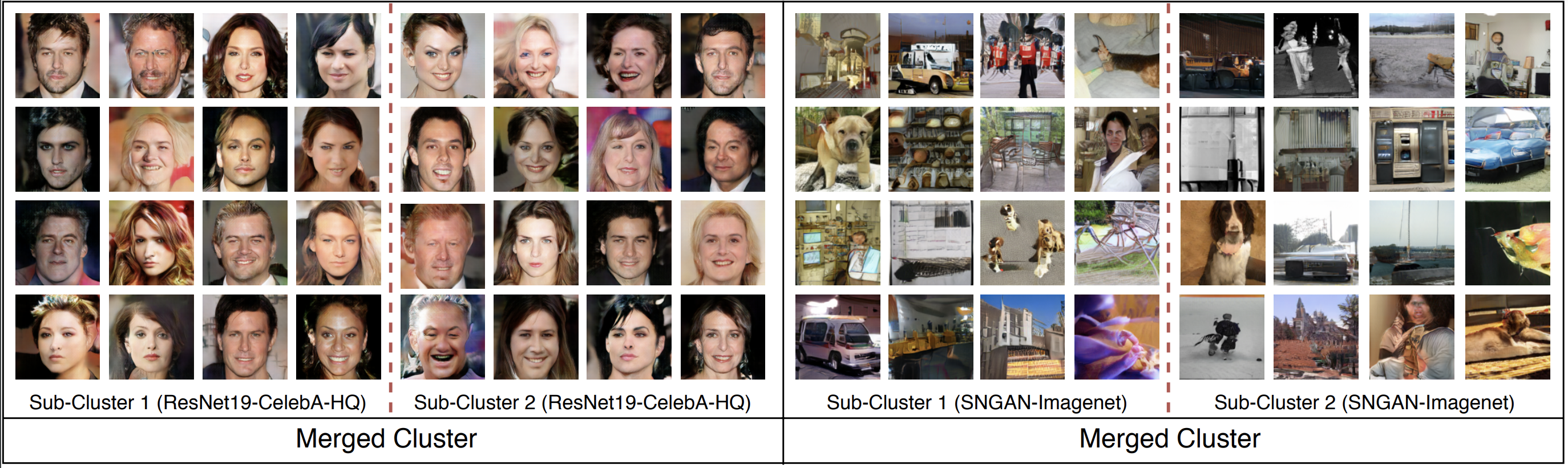 Some example clusters merged by our approach during the merge step. The merge step successfully combines clusters having the same majority GAN source. |