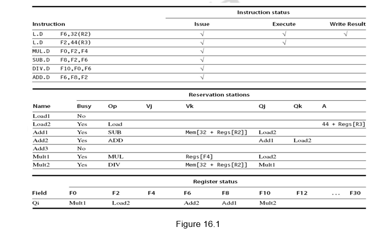 Register result status—Indicates which functional unit will write each register, if one exists. It is blank when there are no pending instructions that will write that register. The instruction status gives the status of each instruction in the instruction window. All the three data structures are shown in Figure 16.1.