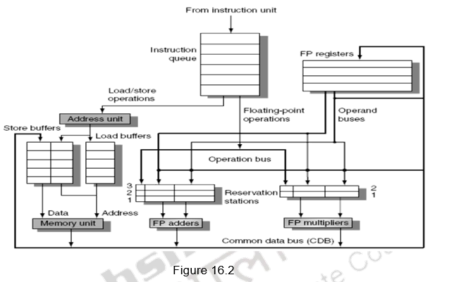 Figure 16.2 shows the organization of the Tomasulo’s dynamic scheduler. Instructions are taken from the instruction queue and issued. During the issue stage, the instruction is decoded and allocated an RS entry. The RS station also buffers the operands if available. Otherwise, the RS entry marks the pending RS value in the Q field. The results are passed through the CDB and go to the appropriate register, as dictated by the register result data structure, as well as the pending RSs.