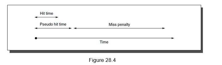 A related approach is called pseudo-associative or column associative. Accesses proceed just as in the direct-mapped cache for a hit. On a miss, however, before going to the next lower level of the memory hierarchy, a second cache entry is checked to see if it matches there. A simple way is to invert the most significant bit of the index field to find the other block in the ―pseudo set.‖ Pseudo-associative caches then have one fast and one slow hit time—corresponding to a regular hit and a pseudo hit—in addition to the miss penalty. Figure 28.4 shows the relative times. One danger would be if many fast hit times of the direct-mapped cache became slow hit times in the pseudo-associative cache. The performance would then be degraded by this optimization. Hence, it is important to indicate for each set which block should be the fast hit and which should be the slow one. One way is simply to make the upper one fast and swap the contents of the blocks. Another danger is that the miss penalty may become slightly longer, adding the time to check another cache entry.