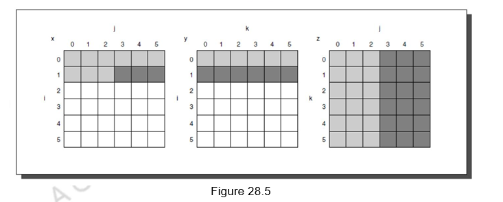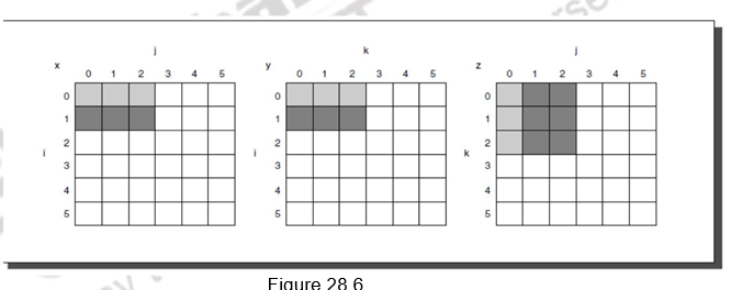 The two inner loops read all N by N elements of z, read the same N elements in a row of y repeatedly, and write one row of N elements of x. Figure 28.5 shows a snapshot of the accesses to the three arrays. A dark shade indicates a recent access, a light shade indicates an older access, and white means not yet accessed.
