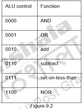 We shall first of all look at the ALU control. The implementation discussed here is specifically for the MIPS architecture and for the subset of instructions pointed out earlier. You just need to get the concepts from this discussion. The ALU uses 4 bits for control. Out of the 16 possible combinations, only 6 are used for the subset under consideration. This is indicated in Figure 9.2. Depending on the type of instruction class, the ALU will need to perform one of the first five functions. (NOR is needed for other parts of the MIPS instruction set not discussed here.) For the load word and store word instructions, we use the ALU to compute the memory address. This is done by addition. For the R-type instructions, the ALU needs to perform one of the five actions (AND, OR, subtract, add, or set on less than), depending on the value of the 6-bit funct (or function) field in the low-order bits of the instruction (refer to the instruction formats). For a branch on equal instruction, the ALU must perform a subtraction, for comparison.