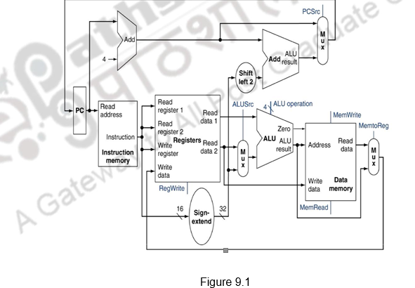 The control unit must be capable of taking inputs about the instruction and generate all the control signals necessary for executing that instruction, for eg. the write signal for each state element, the selector control signal for each multiplexor, the ALU control signals, etc. Figure 9.1 below shows the complete data path implementation for the MIPS architecture along with an indication of the various control signals required.