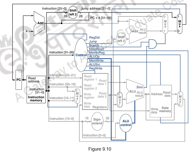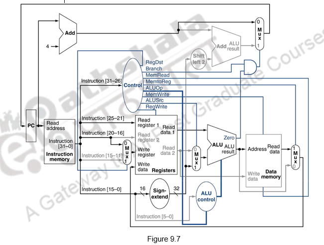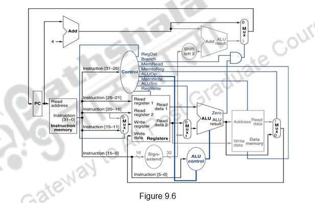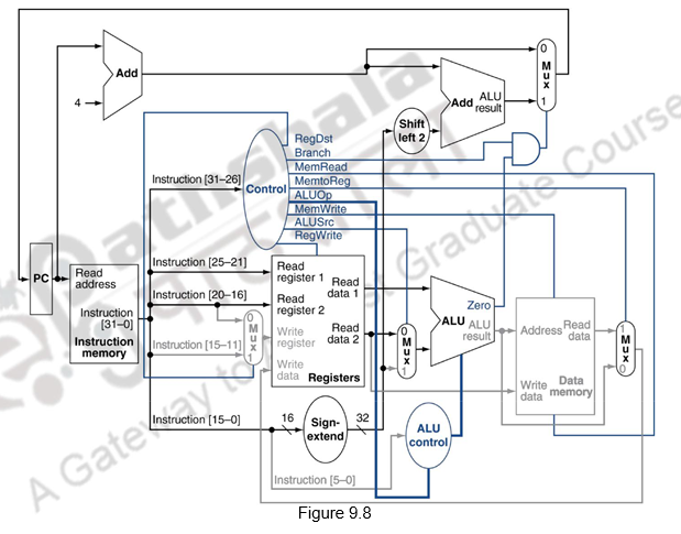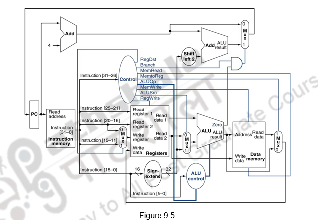 To the simple datapath already shown, we shall add all the required control signals. Figure 9.5 shows these additions plus the ALU control block, the write signals for state elements, the read signal for the data memory, and the control signals for the multiplexors. Since all the multiplexors have two inputs, they each require a single control line. There are seven single-bit control lines plus the 2-bit ALUOp control signal. The seven control signals are listed below: