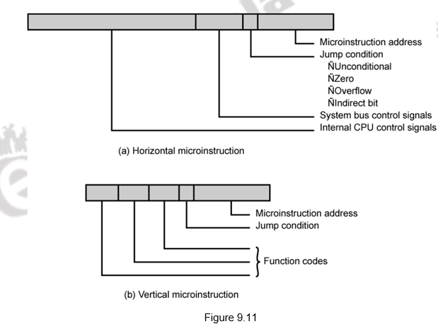 There are basically two types of microprogrammed control – horizontal organization and vertical organization. In the case of horizontal organization, as mentioned above, you can assume that every bit in the control word corresponds to a control signal. In the case of a vertical organization, the signals are grouped and encoded in order to reduce the size of the control word. Normally some minimal level of encoding will be done even in the case of horizontal control. The fields will remain encoded in the control memory and they must be decoded to get the individual control signals. Horizontal organization has more control over the potential parallelism of operations in the datapath; however, it uses up lots of control store. Vertical organization, on the other hand, is easier to program, not very different from programming a RISC machine in assembly language, but needs extra level of decoding and may slow the machine down. Figure 9.11 shows the two formats.