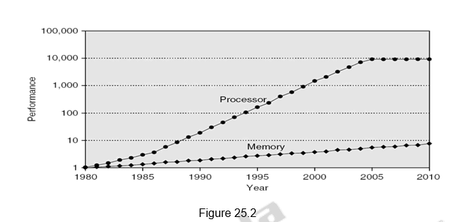 Figure 25.2 shows the memory performance gap. Although people have come up with different technological advancements to increase the speed of the processors as well as memory, the memory speeds have not kept up with the processor speeds, as indicated in Figure 25.2. The hierarchical memory system tries to hide the disparity in speed by placing the fastest memories near the processor.