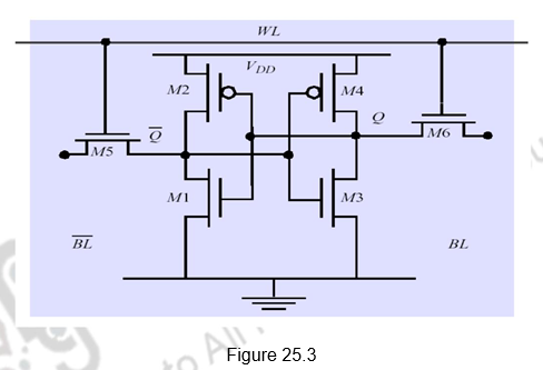 Static RAM: Figure 25.3 gives the construction of a typical SRAM cell. It requires six transistors for construction – hence the reduced density and increased cost. The six transistors are connected in a cross connected fashion. They provide regular and inverted outputs. Since it is implemented using CMOS process, it requires low power to retain the bit.