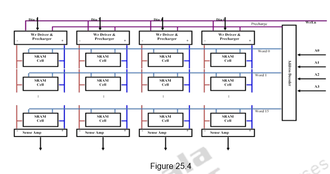 Organization of SRAM Memory: Figure 25.4 shows the single dimensional organization of an SRAM memory consisting of 16 words of 4-bits each. The four address bits are given to the address decoder which selects one of the 16 words. All bits of that word are selected. Write Enable signal is used to enable the write operation. The Data input lines are used to write fresh data into the selected word and the Data output lines are used to read data from the selected word.