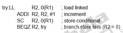 At the end of this sequence the contents of R4 and the memory location specified by R1 have been atomically exchanged. Any time a processor intervenes and modifies the value in memory between the LL and SC instructions, the SC returns 0 in R3, causing the code sequence to try again.