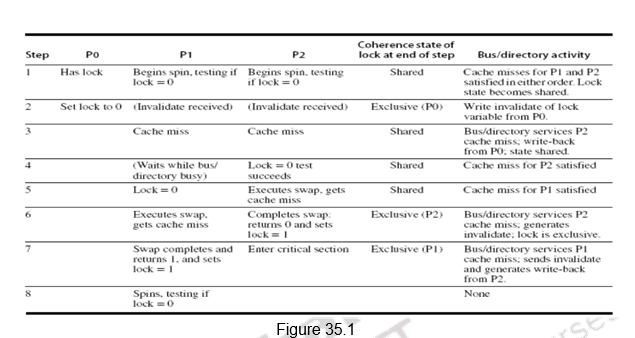 The spin lock mechanism using cache coherence is illustrated in Figure 35.1. Processor P0 has the lock and P1 and P2 are reading the lock status. So, the lock status becomes shared. One of them will be serviced first. When processor P0 releases the lock, it invalidates all other caches. They must fetch the new value to update their copy of the lock. One such cache gets the copy of the unlocked value (0) first and performs the swap. When the cache miss of other processors is satisfied, they find that the variable is already locked, so they must return to testing and spinning.