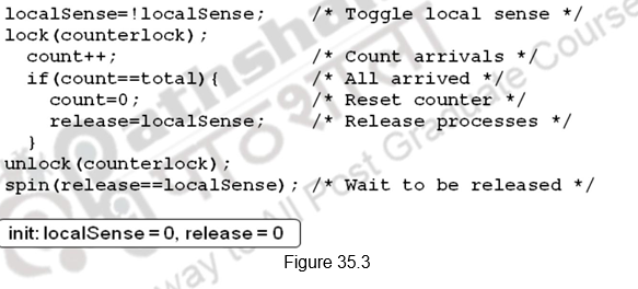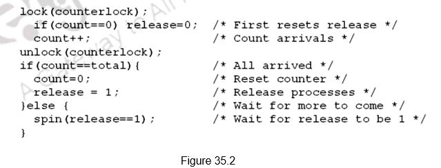 Figure 35.2 shows how barrier synchronization can be implemented. The first processor entering the barrier resets the release and increments the count. As each processor enters the barrier it acquires the lock for count and increments the count value. Once count becomes equal to total, indicating that all the processes have reached the barrier, the barrier is released. Till the count is satisfied, all the processes keep spinning.