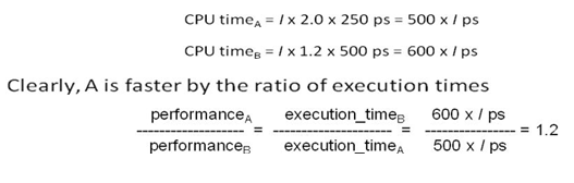 • Computers A and B implement the same ISA. Computer A has a clock cycle time of 250 ps and an effective CPI of 2.0 for some program and computer B has a clock cycle time of 500 ps and an effective CPI of 1.2 for the same program. Which computer is faster and by how much?