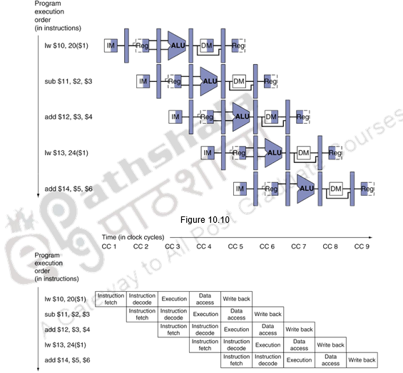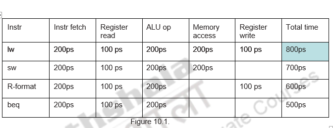 Consider the details given in Figure 10.1. Assume that it takes 100ps for a register read or write and 200ps for all other stages. Let us calculate the speedup obtained by pipelining.