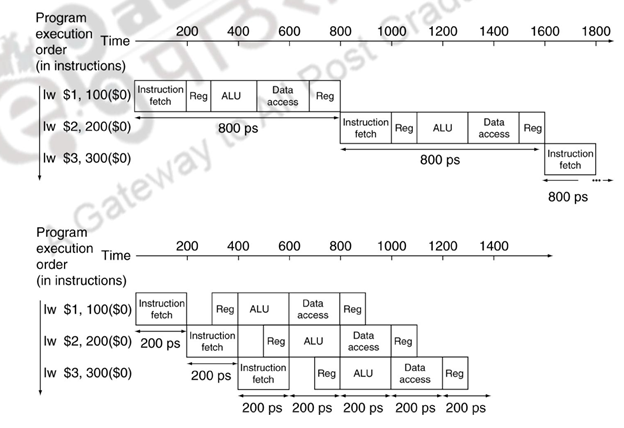 For a non pipelined implementation it takes 800ps for each instruction and for a pipelined implementation it takes only 200ps.