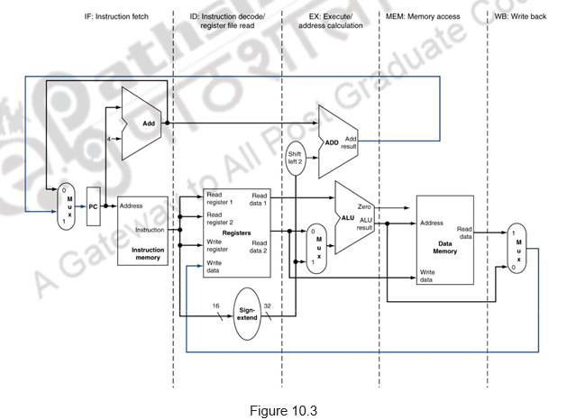 The multi-clock-cycle pipeline diagram showing the resource utilization is given in Figure 10.10. It can be seen that the Instruction memory is used in eth first stage, The register file is used in the second stage, the ALU in the third stage, the data memory in the fourth stage and the register file in the fifth stage again.