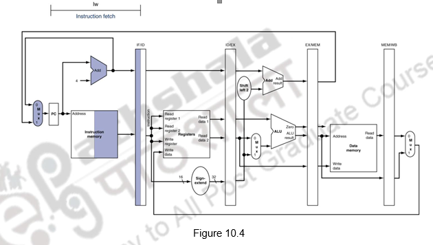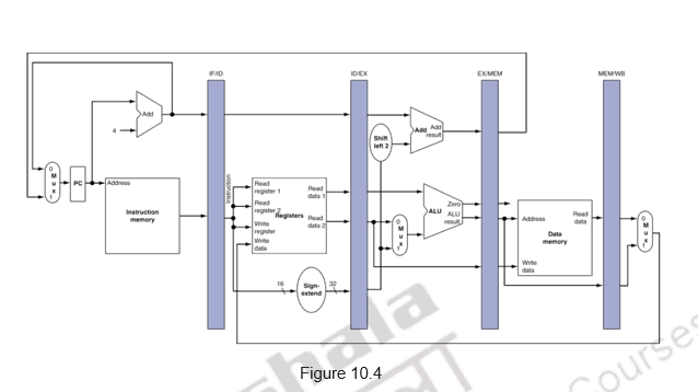 Figure 10.4 shows how buffers are introduced between the stages. This is mandatory. Each stage takes in data from that buffer, processes it and write into the next buffer. Also note that as an instruction moves down the pipeline from one buffer to the next, its relevant information also moves along with it. For example, during clock cycle 4, the information in the buffers is as follows: