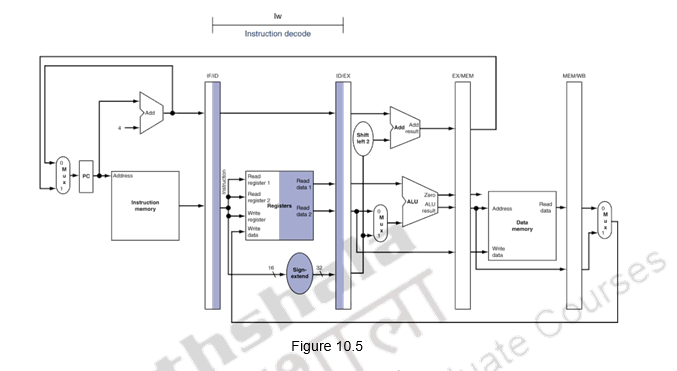 We shall look at the single-clock-cycle diagrams for the load & store instructions of the MIPS ISA. Figure 10.4 shows the instruction fetch for a load / store instruction. Observe that the PC is used to fetch the instruction, it is written into the IF/ID buffer and the PC is incremented by 4. Figure 10.5 shows the next stage of ID. The instruction is decoded, the register file is read and the operands are written into the ID/EX buffer. Note that the entire information of the instruction including the destination register is written into the ID/EX buffer. The highlights in the figure show the resources involved. Figure 10.6 shows the execution stage. The base register’s contents and the sign extended displacement are fed to the ALU, the addition operation is initiated and the ALU calculates the memory address. This effective address is stored in the EX/MEM buffer. Also the destination register’s information is passed from the ID/EX buffer to the EX/MEM buffer. Next, the memory access happens and the read data is written into the MEM/WB buffer. The destination register’s information is passed from the EX/MEM buffer to the MEM/WB buffer. This is illustrated in Figure 10.7. The write back happens in the last stage. The data read from the data memory is written into the destination register specified in the instruction. This is shown in Figure 10.8. The destination register information is passed on from the MEM/WB memory backwards to the register file, along with the data to be written. The datapath is shown in Figure 10.9.