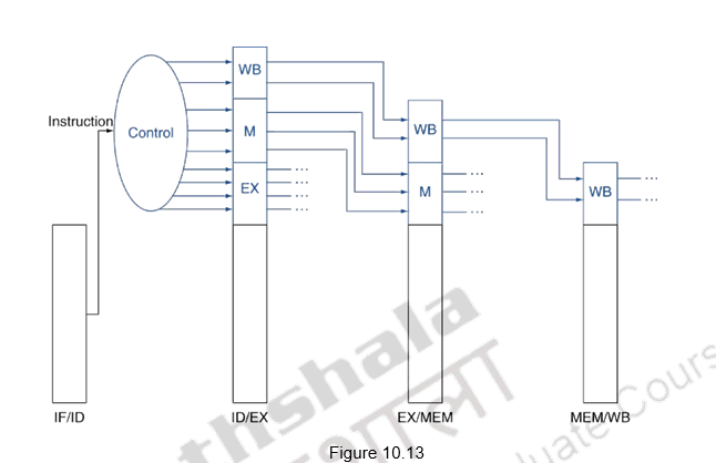 All the control signals indicated are not required at the same time. Different control signals are required at different stages of the pipeline. But the decision about the generation of the various control signals is done at the second stage, when the instruction is decoded. Therefore, just as the data flows from one stage to another as the instruction moves from one stage to another, the control signals also pass on from one buffer to another and are utilized at the appropriate instants. This is shown in Figure 10.13. The control signals for the execution stage are used in that stage. The control signals needed for the memory stage and the write back stage move along with that instruction to the next stage. The memory related control signals are used in the next stage, whereas, the write back related control signals move from there to the next stage and used when the instruction performs the write back operation.