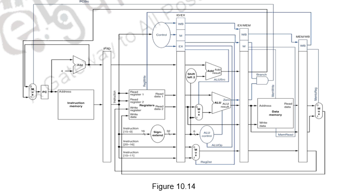 The complete pipeline implementation, along with the control signals used at the various stages is given in Figure 10.14.