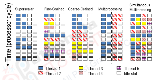 Thus, with register renaming and dynamic scheduling, multiple instructions from independent threads can be issued without regard to the dependences among them. The resolution of the dependences will be handled by the dynamic scheduling capability. We need to add a renaming table per thread and keep separate PCs. The independent commitment of each thread can be supported by logically keeping a separate reorder buffer for each thread. Figure 24.1 shows the difference between the various techniques.