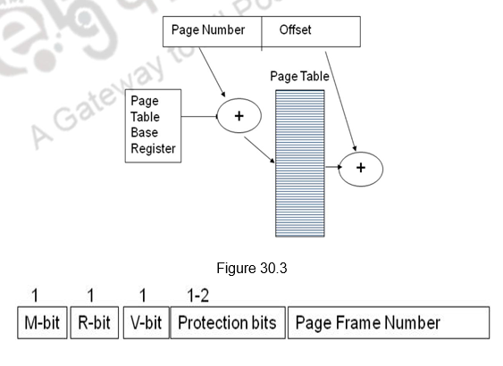 The mapping information between the pages and the page frames is available in a page table. The page table consists of as many pages that a virtual address can support. The base address of the page table is stored in a register called the Page Table Base Register (PTBR). Each process can have one or more of its own page tables and the operating system switches from one page table to another on a context switch, by loading a different address into the PTBR. The page number, which is part of the virtual address, is used to index into the appropriate page table entry. The page table entry contains the physical page frame address, if the page is available in main memory. Otherwise, it specifies wherein secondary storage, the page is available. This generates a page fault and the operating system brings the requested page from secondary storage to main storage. Along with this address information, the page table entry also provides information about the privilege level associated with the page and the access rights of the page. This helps in p roviding protection to the page. The mapping process is indicated in Figure 30.3. Figure 30.4 shows a typical page table entry. The dirty or modified bit indicates whether the page was modified during the cache residency period.