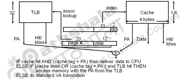 Recall that the caches need a physical address, unless we use virtual caches. As discussed with respect to cache optimizations, machines with TLBs go one step further to reduce the number of cycles/cache access. They overlap the cache access with the TLB access. That is, the high order bits of the virtual address are used to look in the TLB while the low order bits are used as index into the cache. The flow is as shown below.