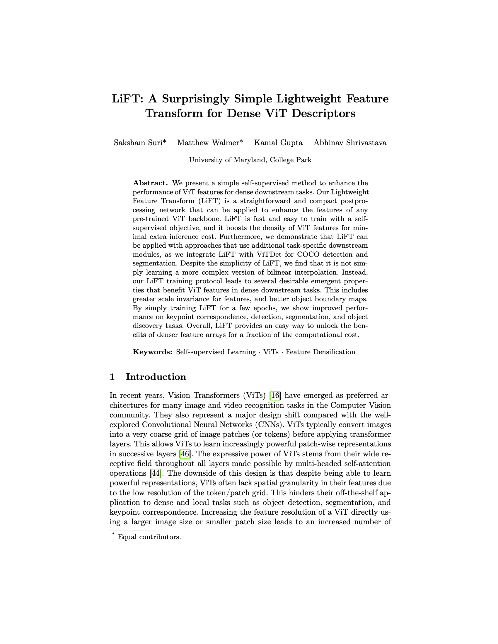 | S. Suri*, M. Walmer*, K. Gupta, A. Shrivastava. LiFT: A Surprisingly Simple Lightweight Feature Transform for Dense ViT Descriptors Paper | Code |