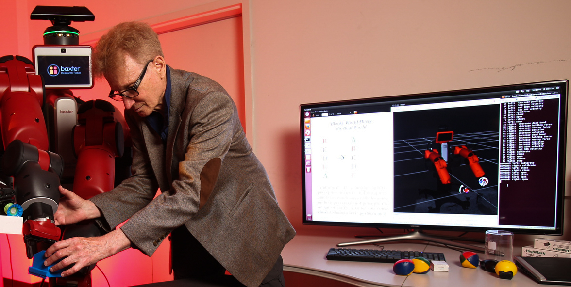 In an article addressing the future of artificial intelligence, Tanya Lewis of Live Science.com turned to Professor Don Perlis for insight on the history and developments that have taken place in AI over the last several years. Perlis explained to Lewis that humans have eagerly anticipated the development of 'conscious machines' since the inception of Artificial Intelligence studies in the 1950s. The research that Perlis conducts with his colleagues and students include artificial intelligence: commonsense reasoning; flexible, domain-general, self-adjusting autonomous systems; and philosophical issues surrounding language, mind, consciousness. One of his current projects involves working with Baxter, a interaction production robot (with which Professor Perlis is pictured). Along with his colleagues Professor Yannis Aliomonos (or Computer Science and UMIACS) and Associate Research Scientist Dr. Cornelia Fermuller (of UMIACS), and a team of dedicated graduate students, Perlis ushers in an era where artificial intelligence and machine consciousness move ever closer to reality. Read the article: Artificial Intelligence, Friendly or Frightening?