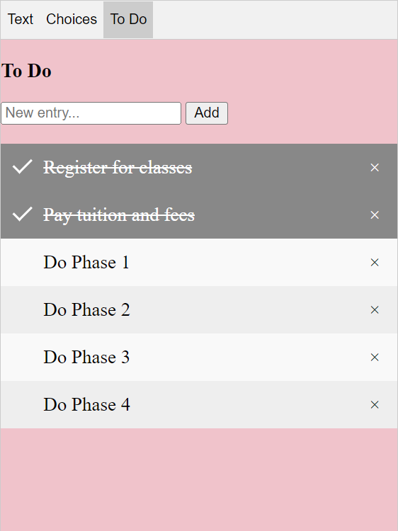 Each student needs to submit their own working program, but as mentioned above you may consult with other members of your team on this homework. If you do, please comment in your code which parts on which you had help. You may also consult to useful online guides such as www.w3schools.com to find code that can be adapted to your needs. If you do use code samples from online guides such as that, please comment in your code which parts are based on such code and provide the URL of the page on which you found the code that you modified. Your team may select to do use either Java (Eclipse) or Android Studio or HTML/CSS/Javascript, and then that decision sets the platform for you for this homework assignment. For this homework assignment, you will create something that looks like an app running on a smartphone with three tabs. The "tabs" might be implemented via buttons in HTML but there are other approaches in HTML. They might be implemented by making use of something like TabLayout in Android Studio, but again there are multiple approaches. They might be implemented using something such as a JTabbedPane. Making choices such as these is one of the challenges of this assignment. Again, feel free to consult with members of your team and to utilize general websites that give examples as you proceed. You have control over the colors and specific visual style aspects. The contents of each tab are described here: Please note that you will submit either a zip file with the APK for this app and the Android Studio project, or a zip file with the runnable JAR and the Eclipse project, or a ZIP file of the HTML and related files, as well as including three screenshots (one of each tab) in your PDF. ELMS has one upload entry for the PDF and a different upload entry for the ZIP file. The PDF will need to contain the screenshots. |