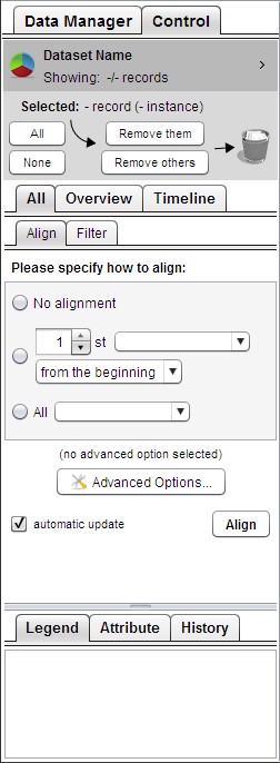 In LifeFlow, the detailed data is displayed in the Timeline Panel. As in LifeLines2, raw data are displayed on a horizontal timeline, with colored triangles representing events. Also as in LifeLines2, each row represents a record. Note that not all functionalities of LifeLines2 are included. The summary feature of LifeLines2, for example. However, some of the missing features of LifeLines2 can be achieved using Overview Panel. For example, the summary feature, which allows the users to select records with certain elapsed time between two events, can be performed by selecting from distribution using Overview Panel. LifeLines2 uses the Align, Rank, Filter framework to facilitate visual analysis.