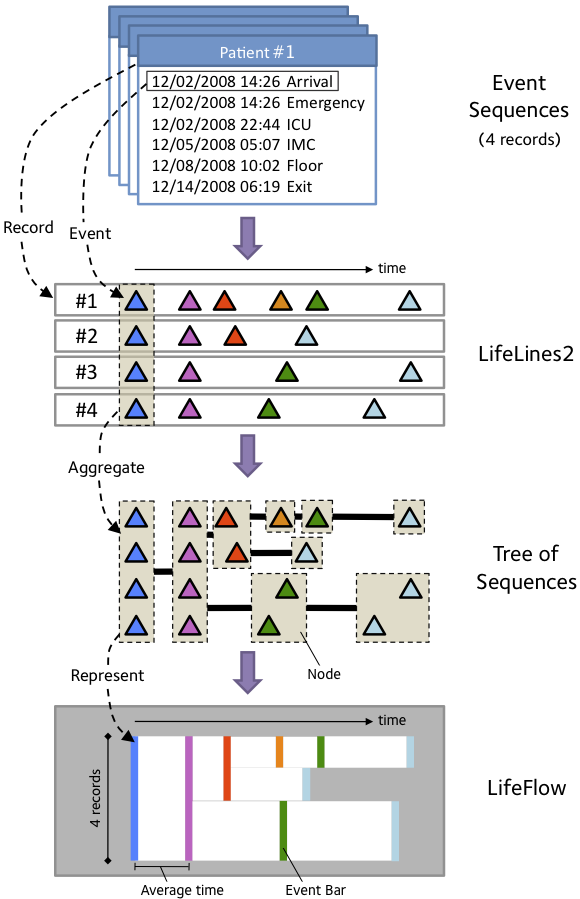 In LifeFlow, the detailed data is displayed in the Timeline Panel. LifeFlow transforms this detailed data for display in the Overview Panel in two steps: aggregation and visualization.