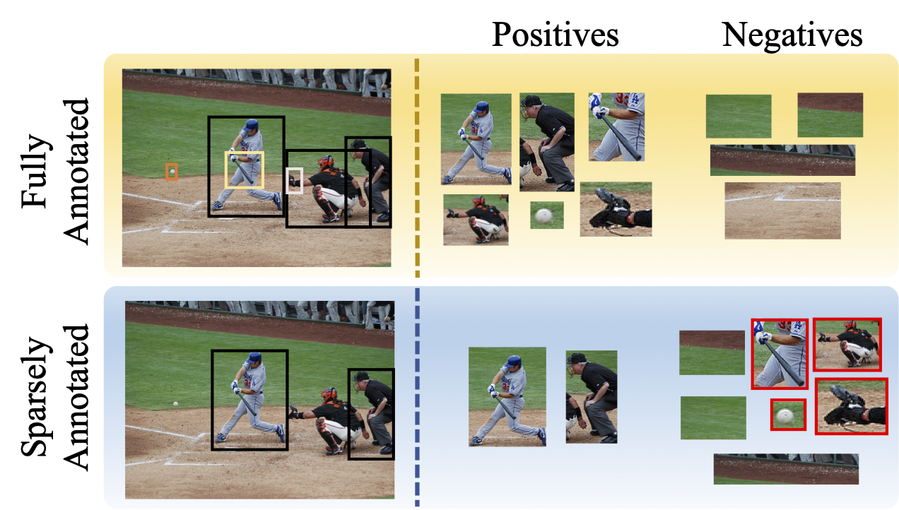 | (Top) Most Object Detection datasets have exhaustive annotations for foreground/positives. During training, the unlabelled regions can be safely considered as background/negatives. Sparsely Annotated Object Detection datasets (bottom) have missing annotations. This results in foreground regions (shown in red) being considered as negatives during training, deteriorating the performance of the classifier. |